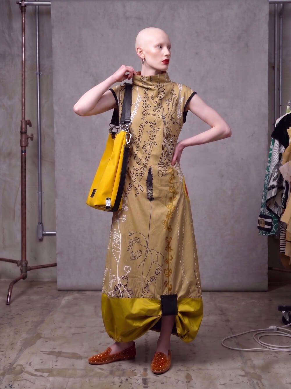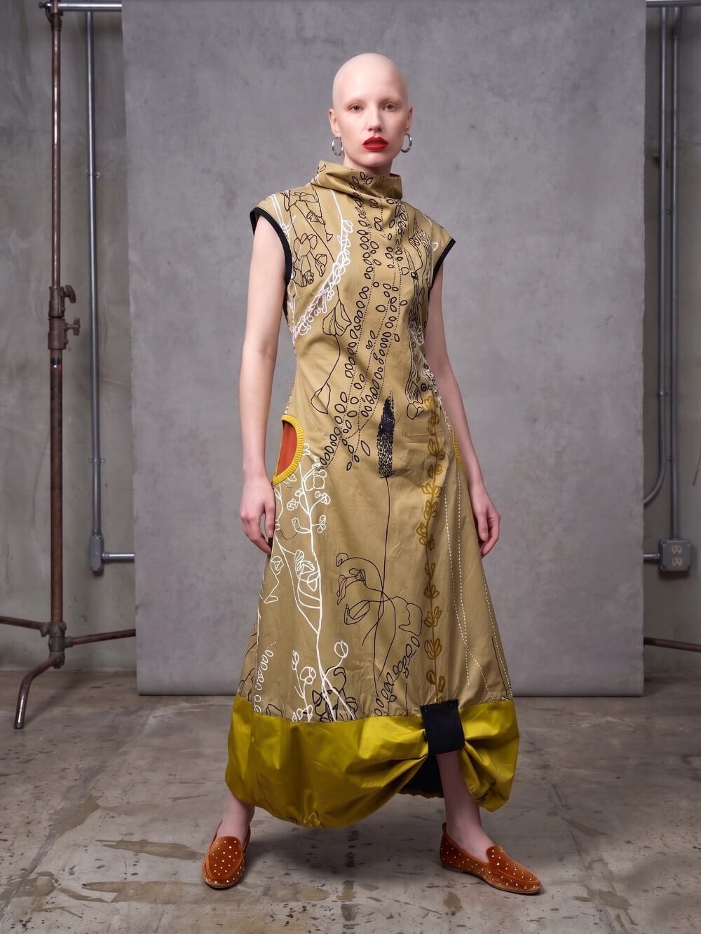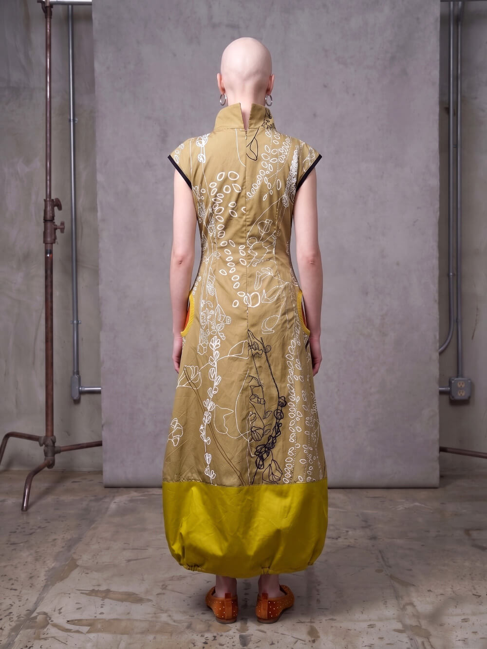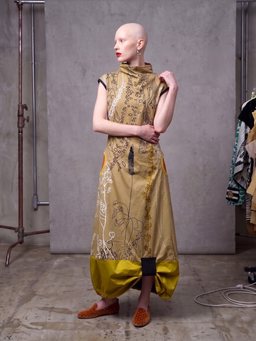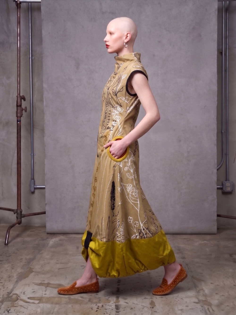 Baza haljine je u zemljanim, peščanim tonovima, a celom dužinom je obogaćena autentičnim, slobodoručnim linijskim ilustracijama koje prepliću botaničke i apstraktne motive.