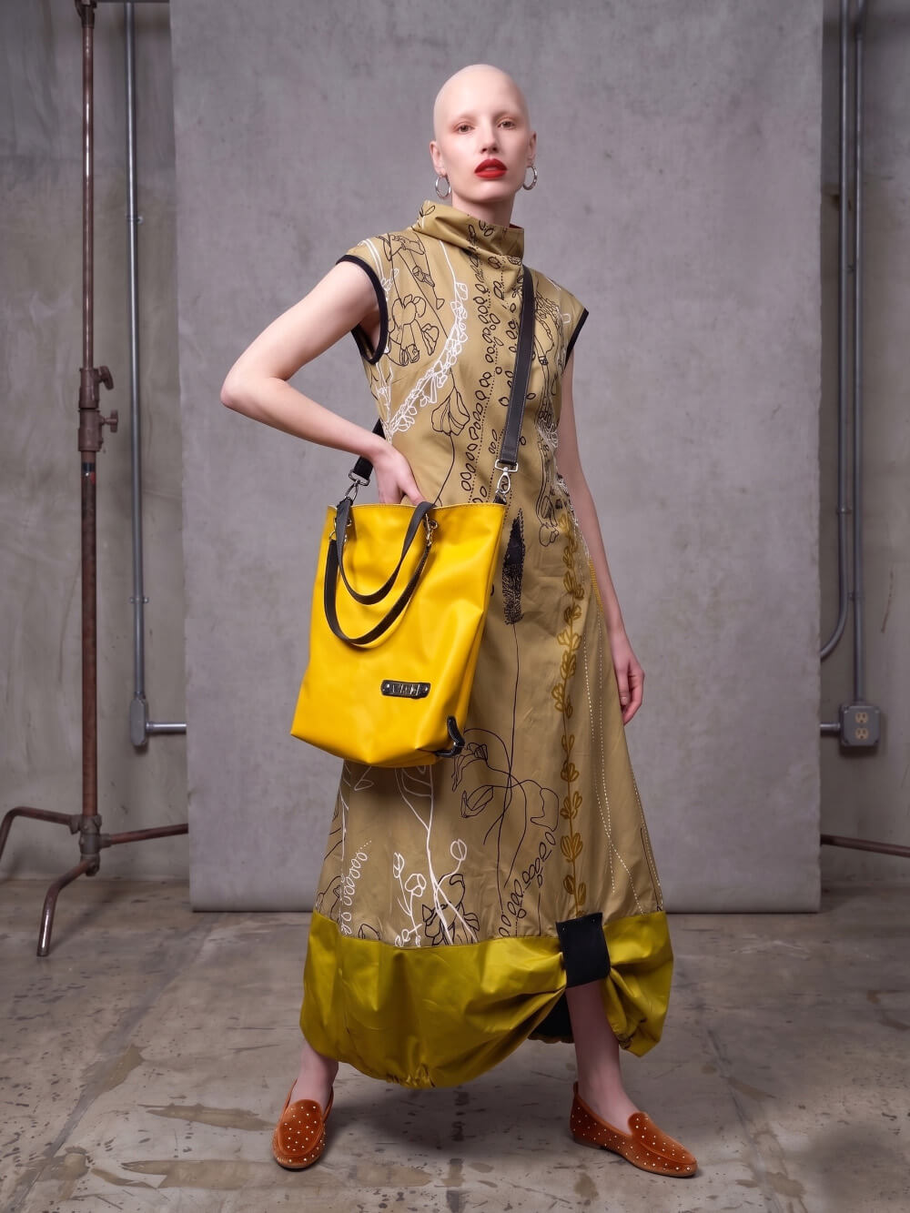 Visoka, blago asimetrična rol-kragna pruža dozu drske elegancije, dok njena unutrašnjost krije terakota boju koju nalazimo i u džepu! Taj kontrast suptilno osvetljava lice i daje onaj moćan, edgy vajb. Džepovi nikada nisu izgledali ovako smelo! Kružni izrezi hrabro su oivičeni moćnim renderom boje senfa, razbijajući formu i dajući haljini urbanu, neustrašivu energiju. Donji rub je apsolutni trijumf dizajna. Dramatičan „bubble“ (balon) kroj u bogatoj oker-zlatnoj-senf boji donosi skulpturalni volumen. Zanimljiv preklop i prorez na prednjoj strani čine da haljina sa svakim vašim korakom dobija novu dimenziju.