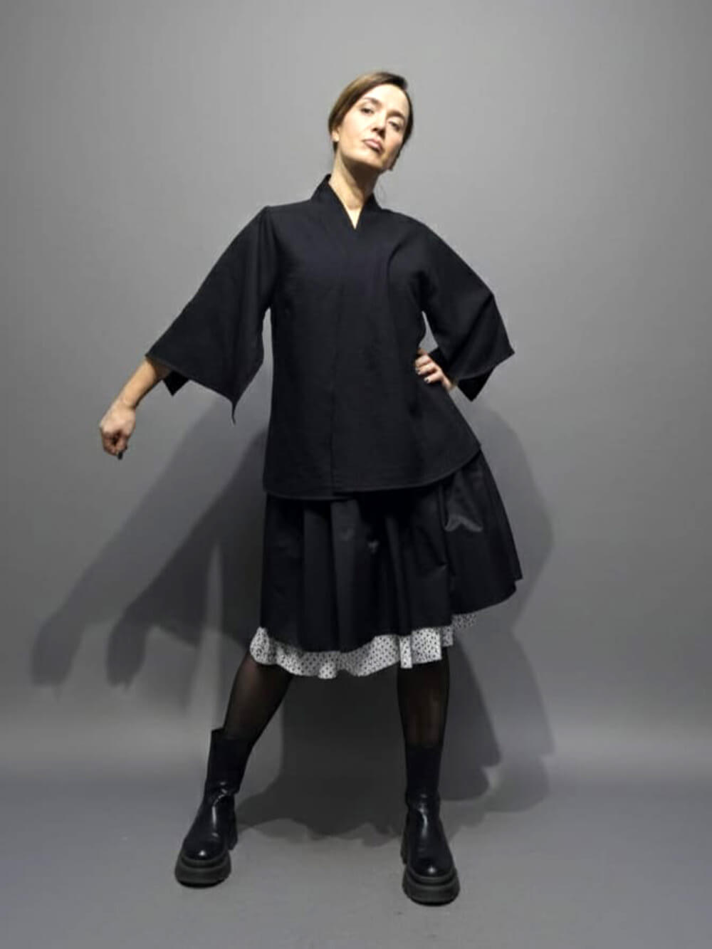 Izrađena od moderne mešavine viskoze, ova košulja donosi najbolje od oba sveta: savremenu teksturu i sofisticiran pad koji se ne gužva, čineći je idealnom za duge dane. Dizajn je pročišćen, ali karakteran – dominiraju široki, skulpturalni rukavi sa efektnim prorezima i naglašenim, prošivenim rubovima koji celoj formi daju strukturu. Može se nositi otkopčana, leti npr.poput sakoa, ili sa pojasom, ili preklopljena i upasana u neki od fantastičnih ŠLIC donjih delova!