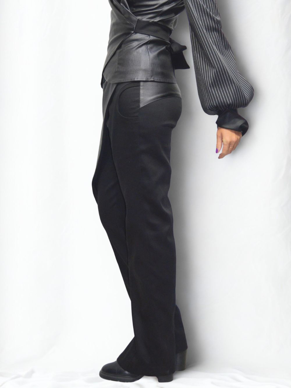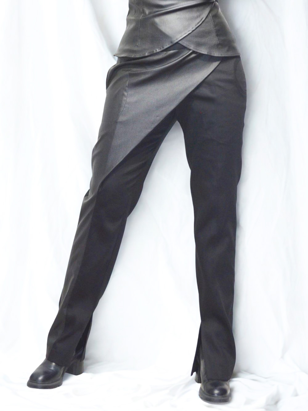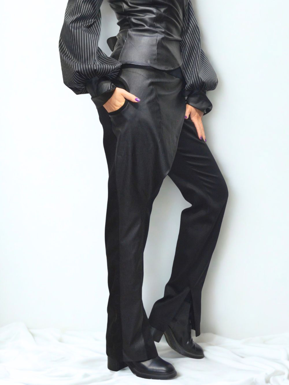 Najlepši model pantalona ikada!!! Pantalone sastavljene od 12 delova. Crne pantalone u kombinaciji debljeg crnog lanenog štofa, sa otvorom sa unutrašnje strane nogavica, tako da se mogu nositi na svu obuću! Asimetrija u svojoj najlepšoj modnoj formi! Dominantni materijal na preklopu je rastegljiv i ima premaz koji deluje kao koža! Fotografije ne mogu verno preneti kako dobro izgleda ovaj model i koliko smo se trudili da svaki štep na njima izgleda perfektno! Pojas je rastegljiv sa lastišem u sebi.