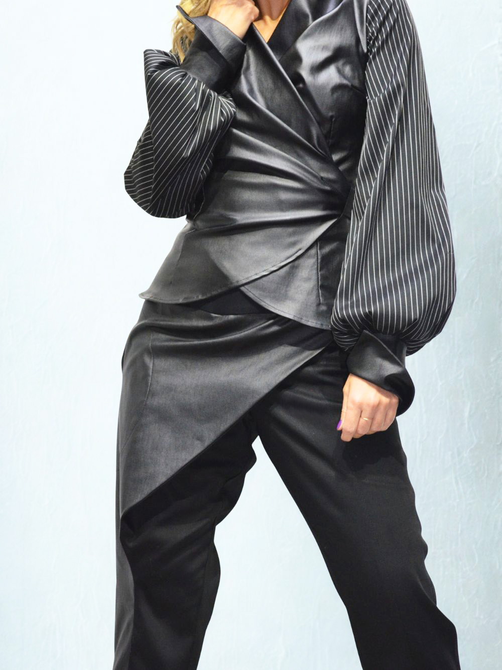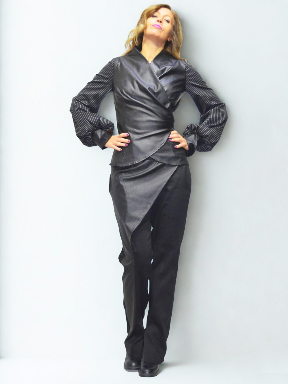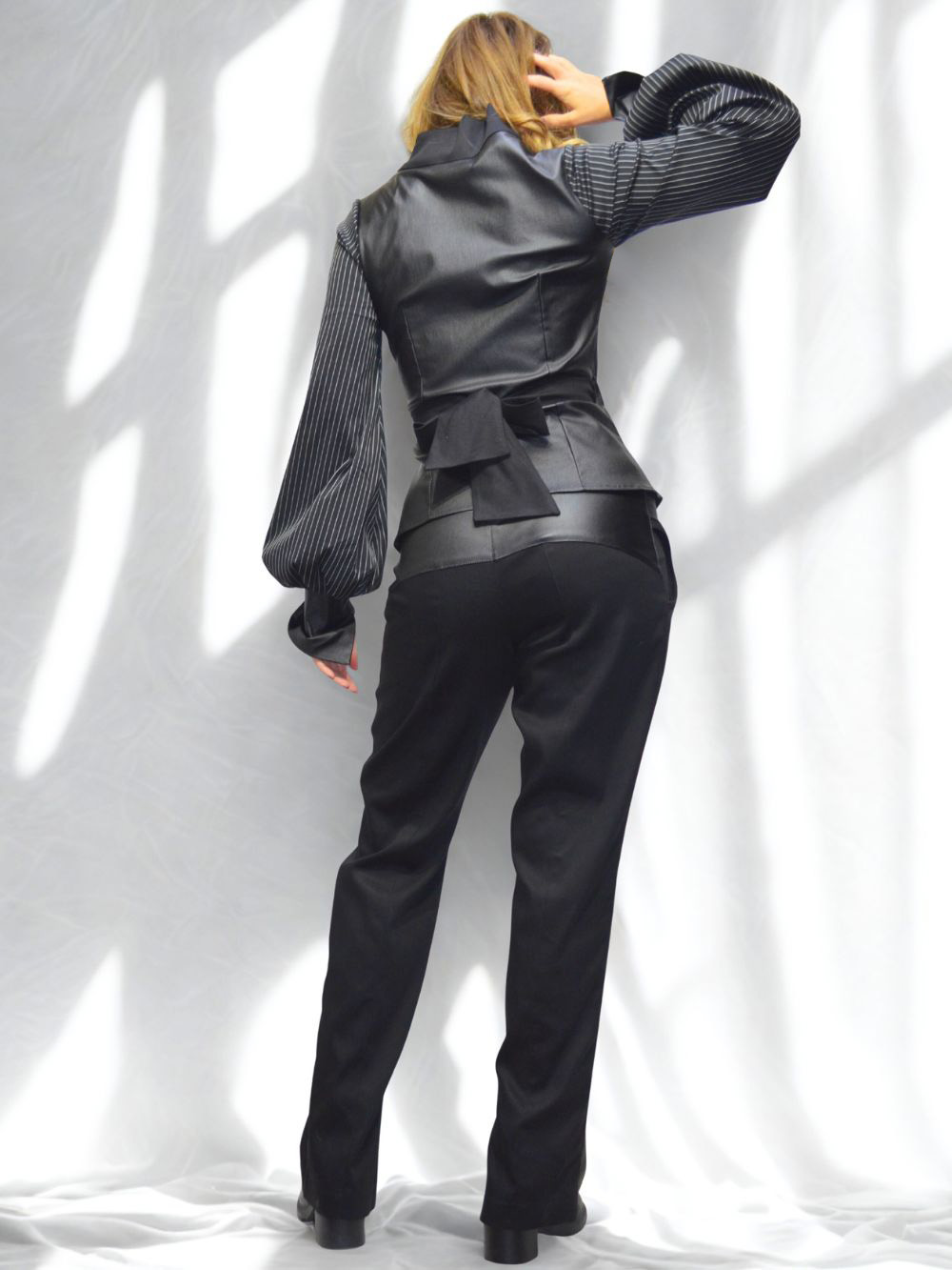 Najlepši model pantalona ikada!!! Pantalone sastavljene od 12 delova. Crne pantalone u kombinaciji debljeg crnog lanenog štofa, sa otvorom sa unutrašnje strane nogavica, tako da se mogu nositi na svu obuću! Asimetrija u svojoj najlepšoj modnoj formi! Dominantni materijal na preklopu je rastegljiv i ima premaz koji deluje kao koža! Fotografije ne mogu verno preneti kako dobro izgleda ovaj model i koliko smo se trudili da svaki štep na njima izgleda perfektno! Pojas je rastegljiv sa lastišem u sebi.