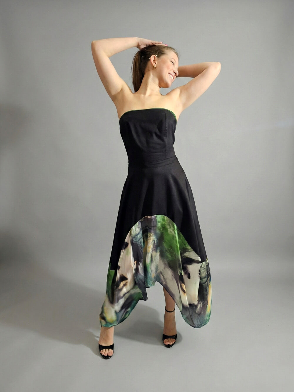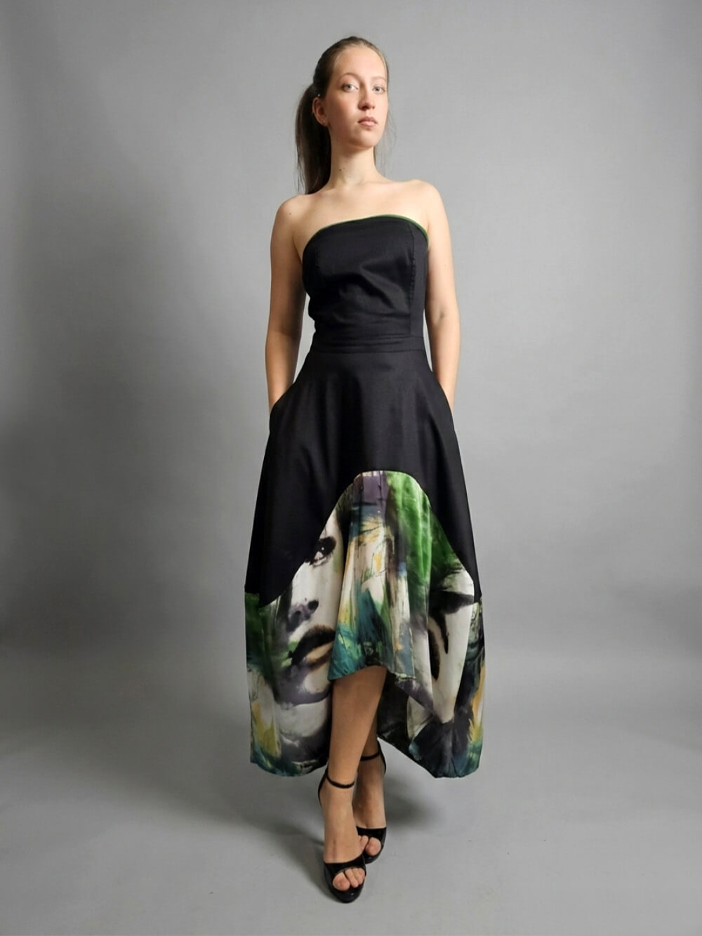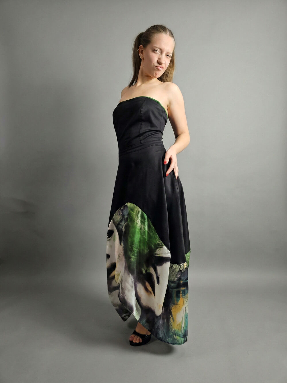Gornji deo u dubokoj crnoj boji je strogo i precizno krojen tako da prati liniju tela, ističući siluetu ravnim izrezom bez bretela. Ipak, pravi preokret dešava se u donjem delu. Raskošna asimetrična suknja – napred kraća, pozadi duža – oslikana je spektakularnim printom lica u smelim, slikarskim potezima šumsko zelene, žute i crne boje. Dizajnirana je sa idejom da spoji visoku estetiku sa beskompromisnom funkcionalnošću, pa krije i jedan apsolutno omiljeni detalj: duboke, praktične džepove u bočnim šavovima za onaj prepoznatljivi, ležerno-samouvereni stav (p.s. džepovi su zeleni!) Haljina je jako rastegljiva, materijal prirodni, savršen, tako da – Ovo nije samo haljina, ovo je stav.