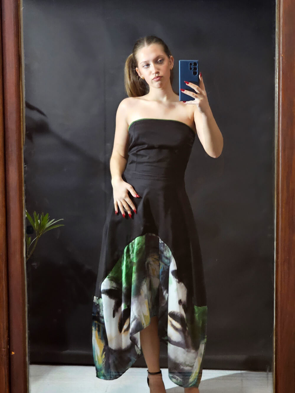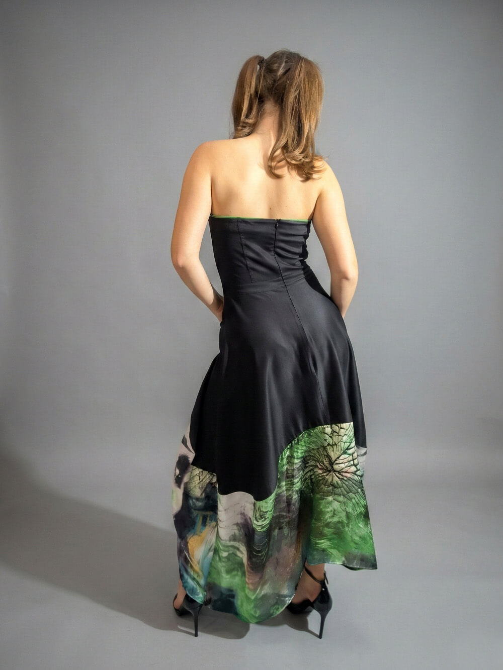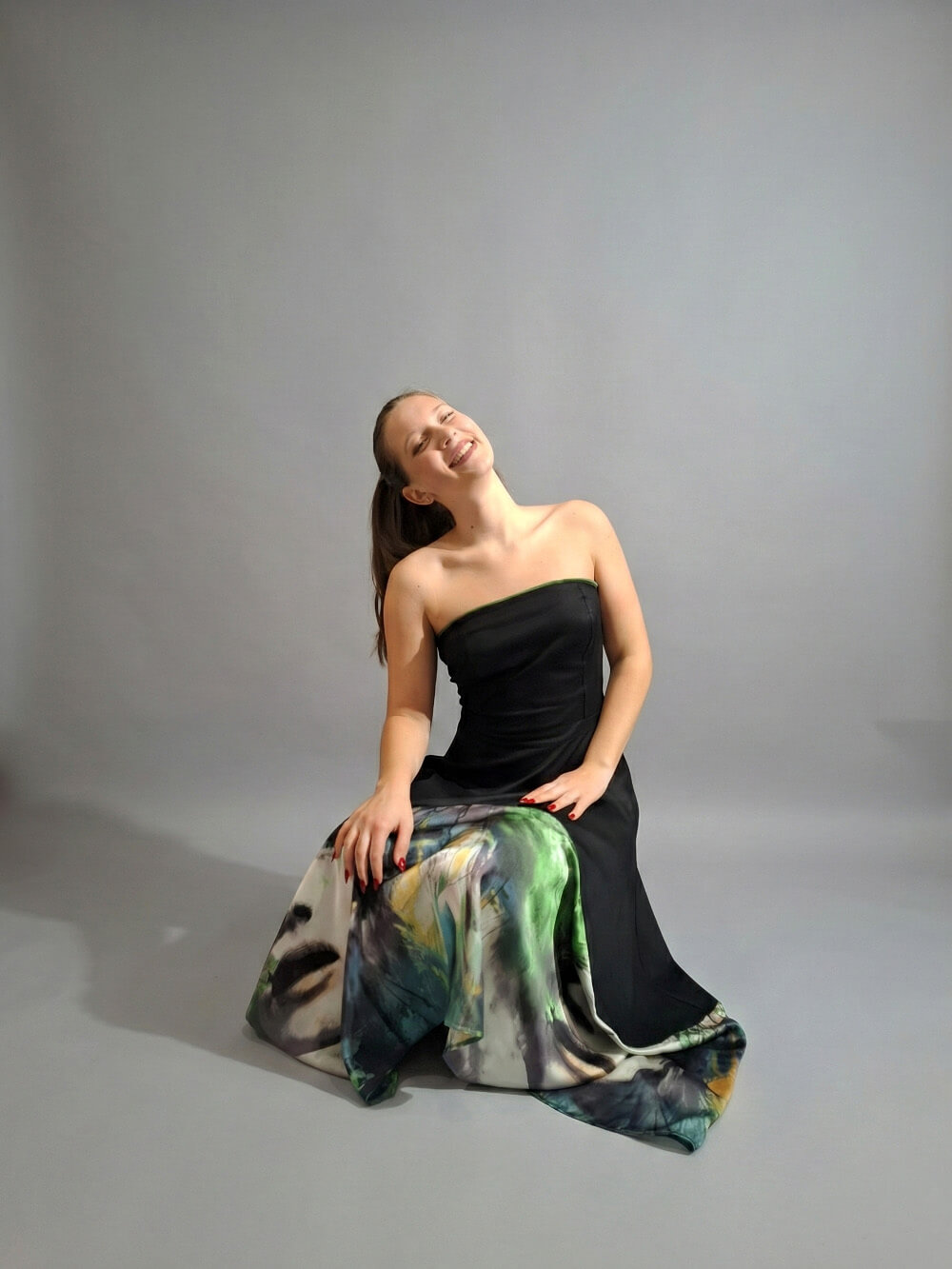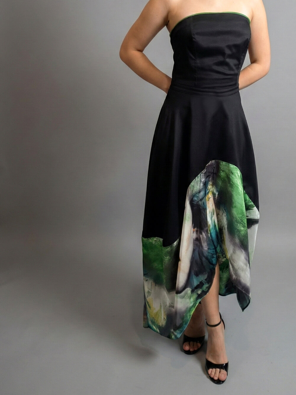 Gornji deo u dubokoj crnoj boji je strogo i precizno krojen tako da prati liniju tela, ističući siluetu ravnim izrezom bez bretela. Ipak, pravi preokret dešava se u donjem delu. Raskošna asimetrična suknja – napred kraća, pozadi duža – oslikana je spektakularnim printom lica u smelim, slikarskim potezima šumsko zelene, žute i crne boje. Dizajnirana je sa idejom da spoji visoku estetiku sa beskompromisnom funkcionalnošću, pa krije i jedan apsolutno omiljeni detalj: duboke, praktične džepove u bočnim šavovima za onaj prepoznatljivi, ležerno-samouvereni stav (p.s. džepovi su zeleni!) Haljina je jako rastegljiva, materijal prirodni, savršen, tako da – Ovo nije samo haljina, ovo je stav.